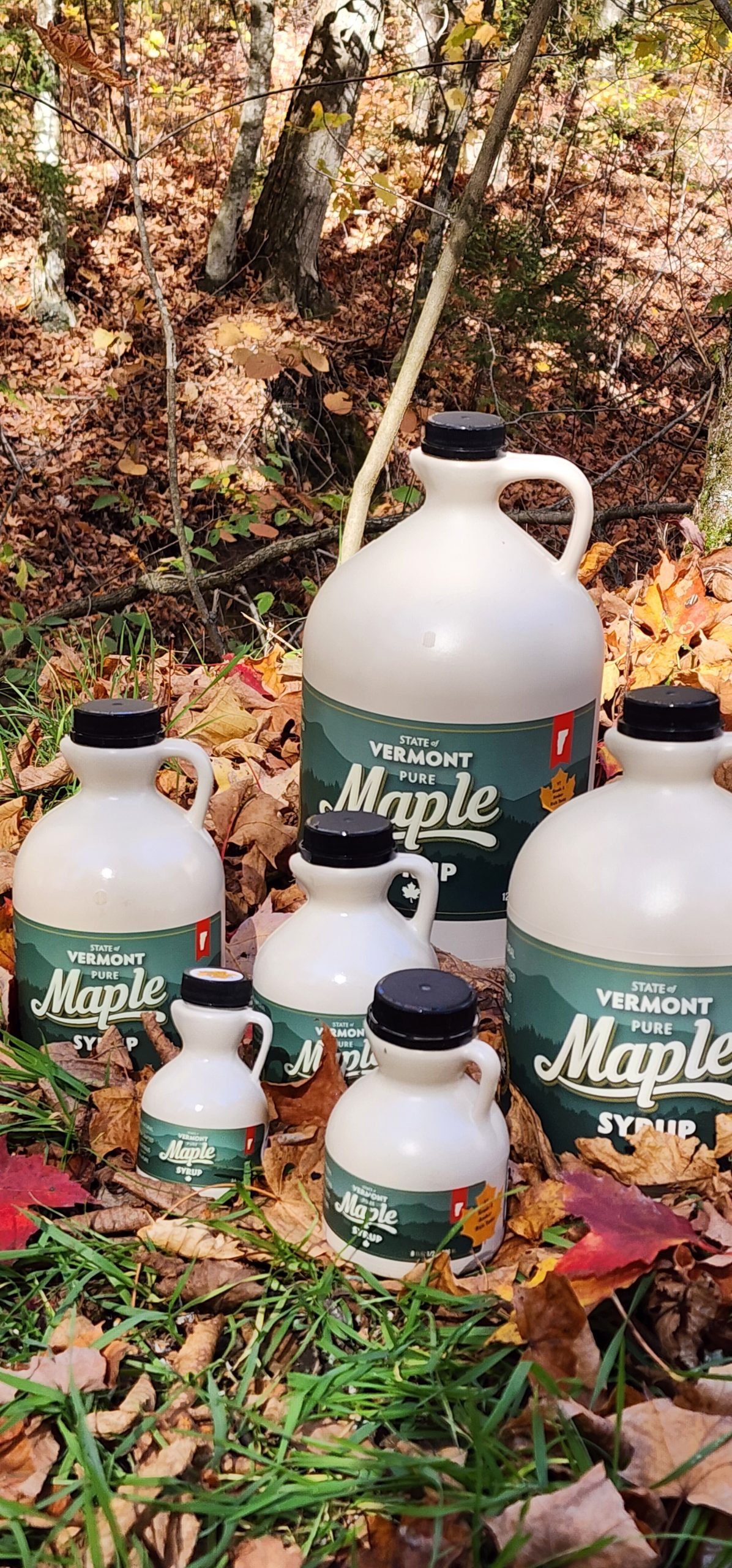 Hi Vue maple syrup in jugs among in fall leaves